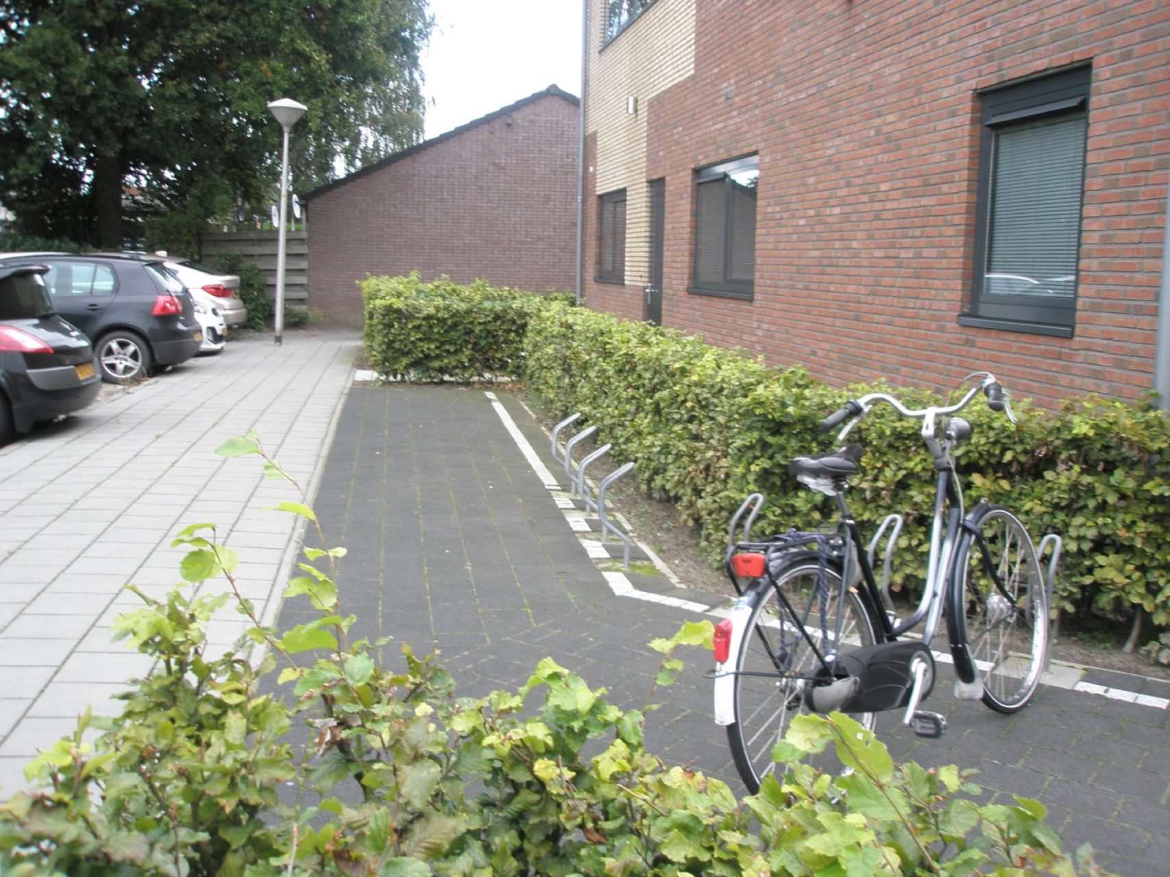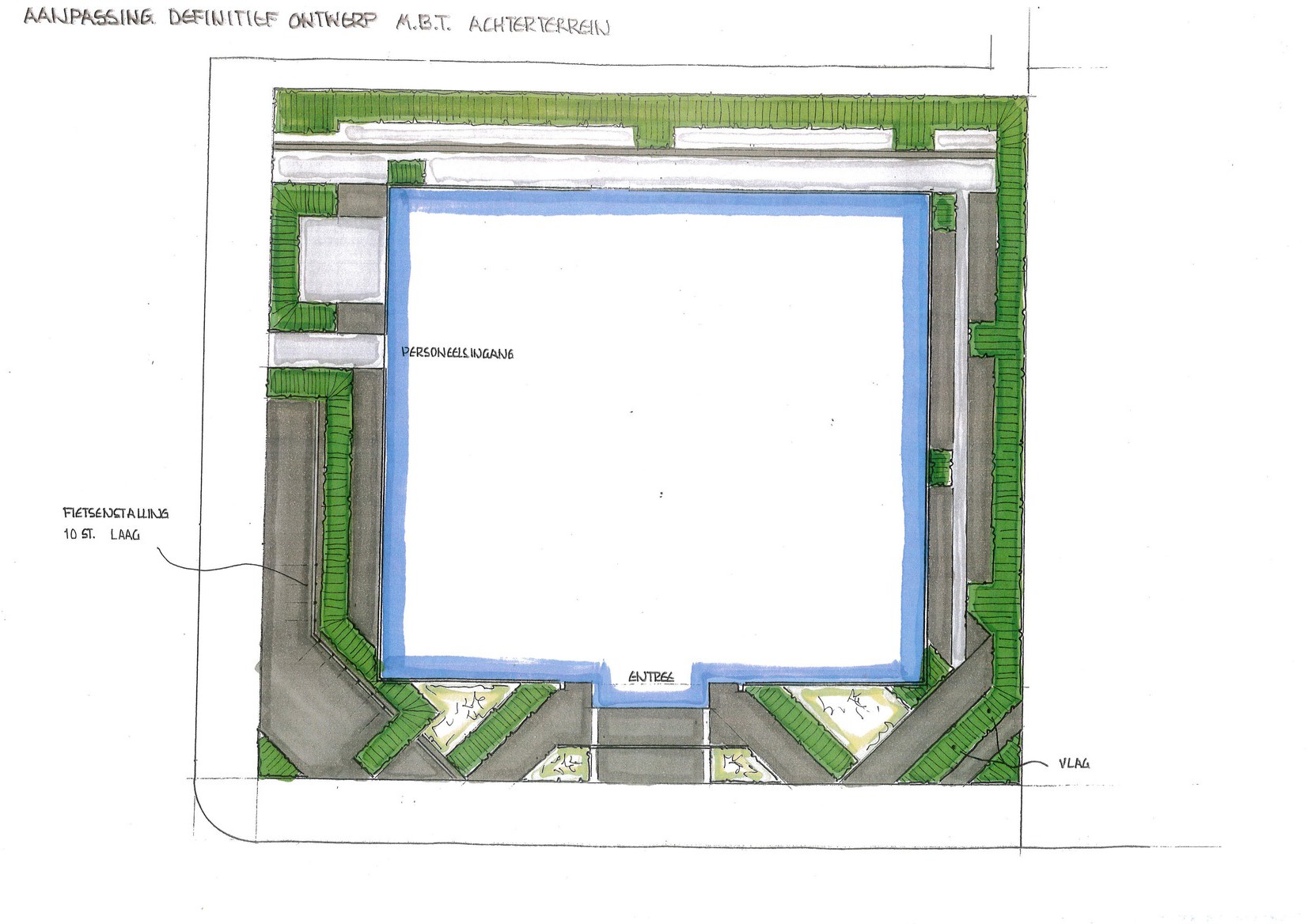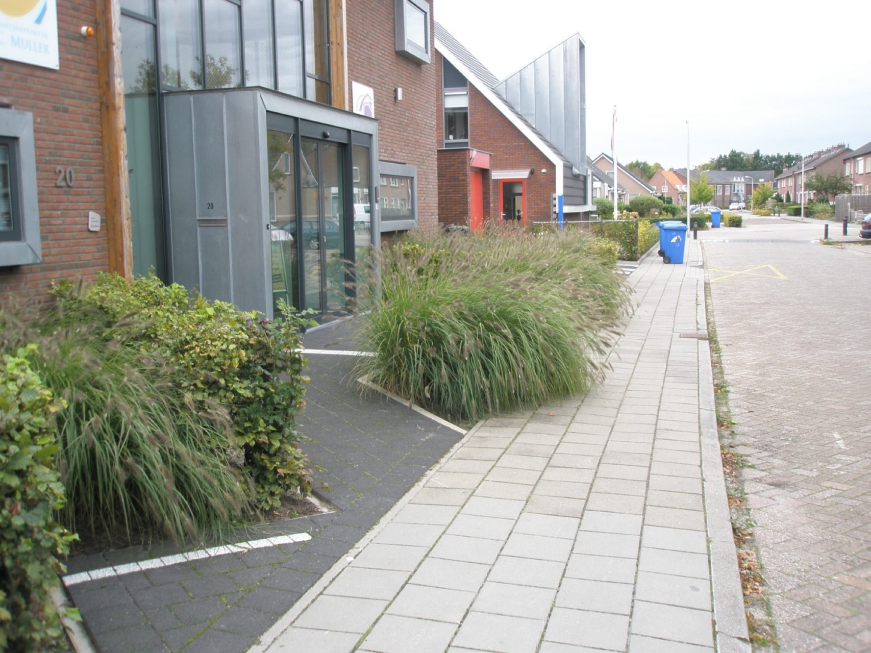De verharding bestaat uit exclusieve Geocolortegels van MBI. Door de aanwezigheid van natuursteen in de toplaag zijn deze tegels kleurvast. De beplanting bestaat uit stak geknipte Beukenhagen in combinatie met siergrassen.