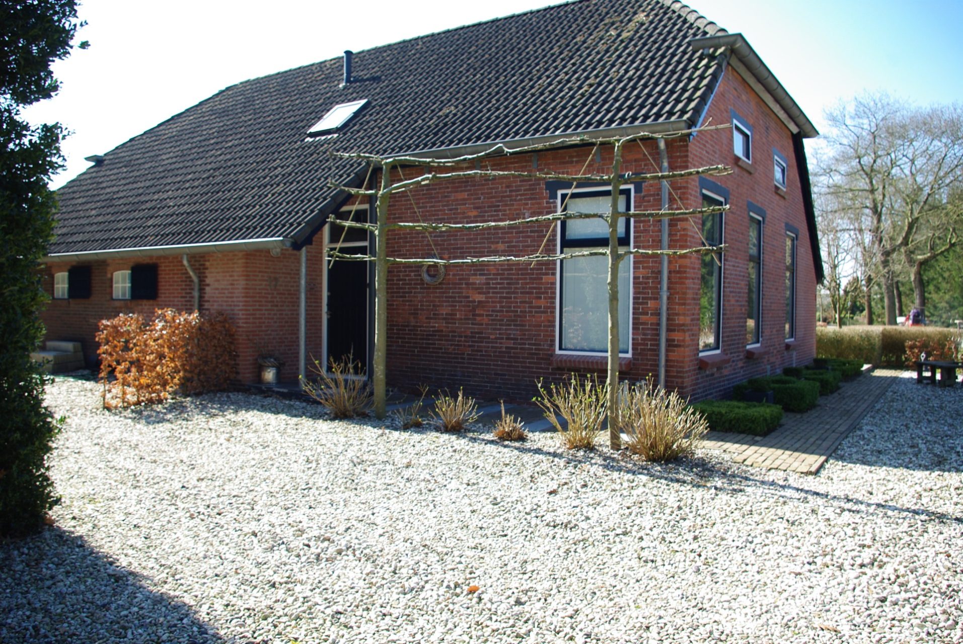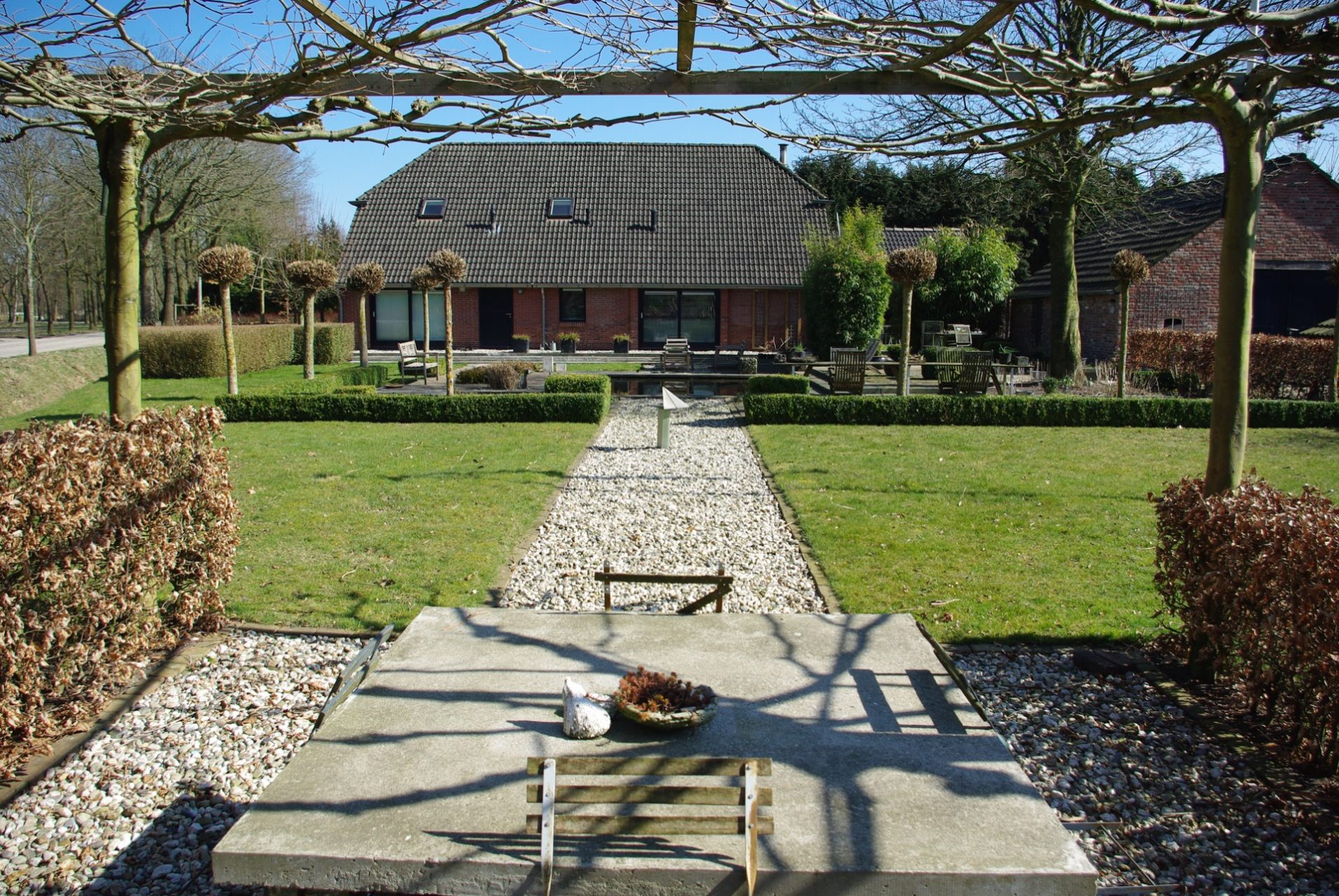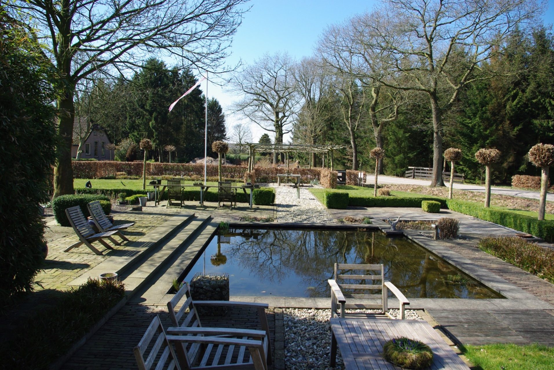 Deze landelijke tuin is gesitueerd rondom een woonboerderij. De belangrijkste eis was dat de tuin een strakke uitstraling moest hebben. Door middel van Beukenhagen en vormbomen is de basisstructuur voor de tuin bepaald. De zichtlijnen vanuit de woning complementeren de strakke uitstraling. Vanuit de woonkeuken is de strakke vijver nadrukkelijk aanwezig.
