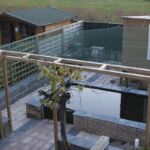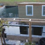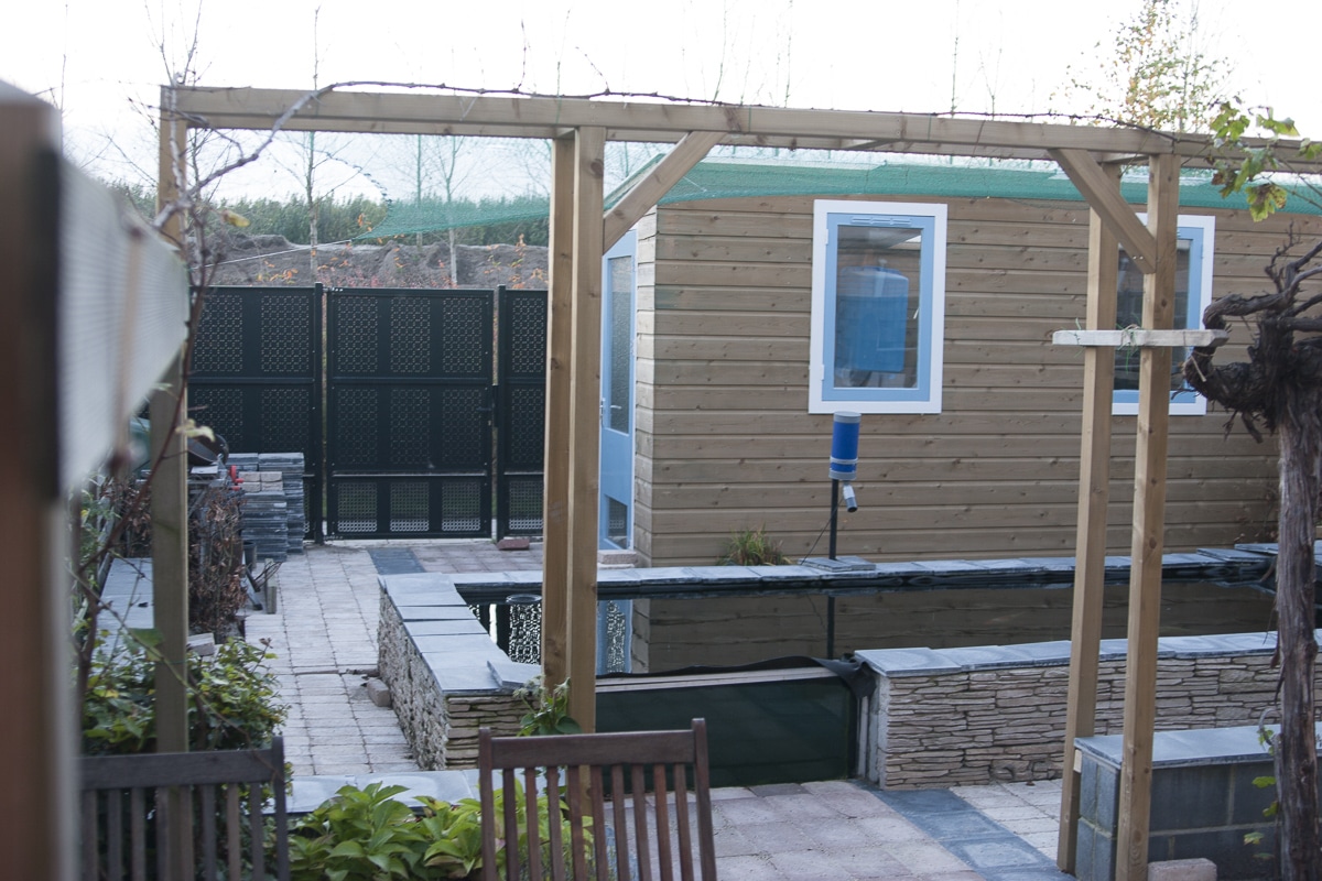 De vijver voor de Koikarpers is ruim 2 meter diep en steekt gedeeltelijk boven het terras uit. Er is een glazen venster aangebracht in de vijvermuur waardoor je de vissen vanaf het terras ziet zwemmen. Vanuit de woning zorgen de bestratingslijnen ervoor dat je aandacht automatisch naar het glazen venster van de vijver wordt getrokken.