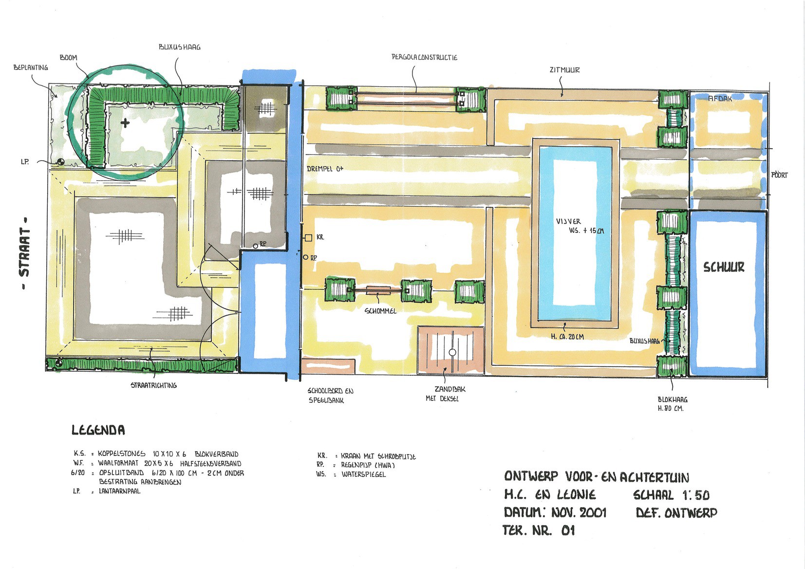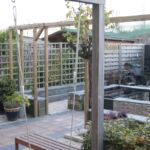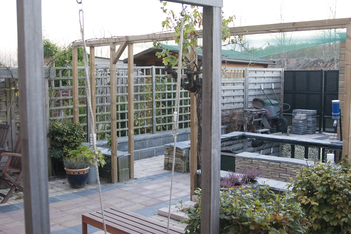 Bij deze woning in Almere hebben wij het ontwerp voor de voor- en achtertuin gemaakt. De tuin heeft een warme mediterrane uitstraling. Door de pergola (constructie) wordt de achtertuin in tweeën gedeeld. Het gedeelte bij de woning waar de meeste zon is, wordt gebruikt voor terras en spelen. Het achterste gedeelte van de tuin is bestemd voor de Koikarper hobby.