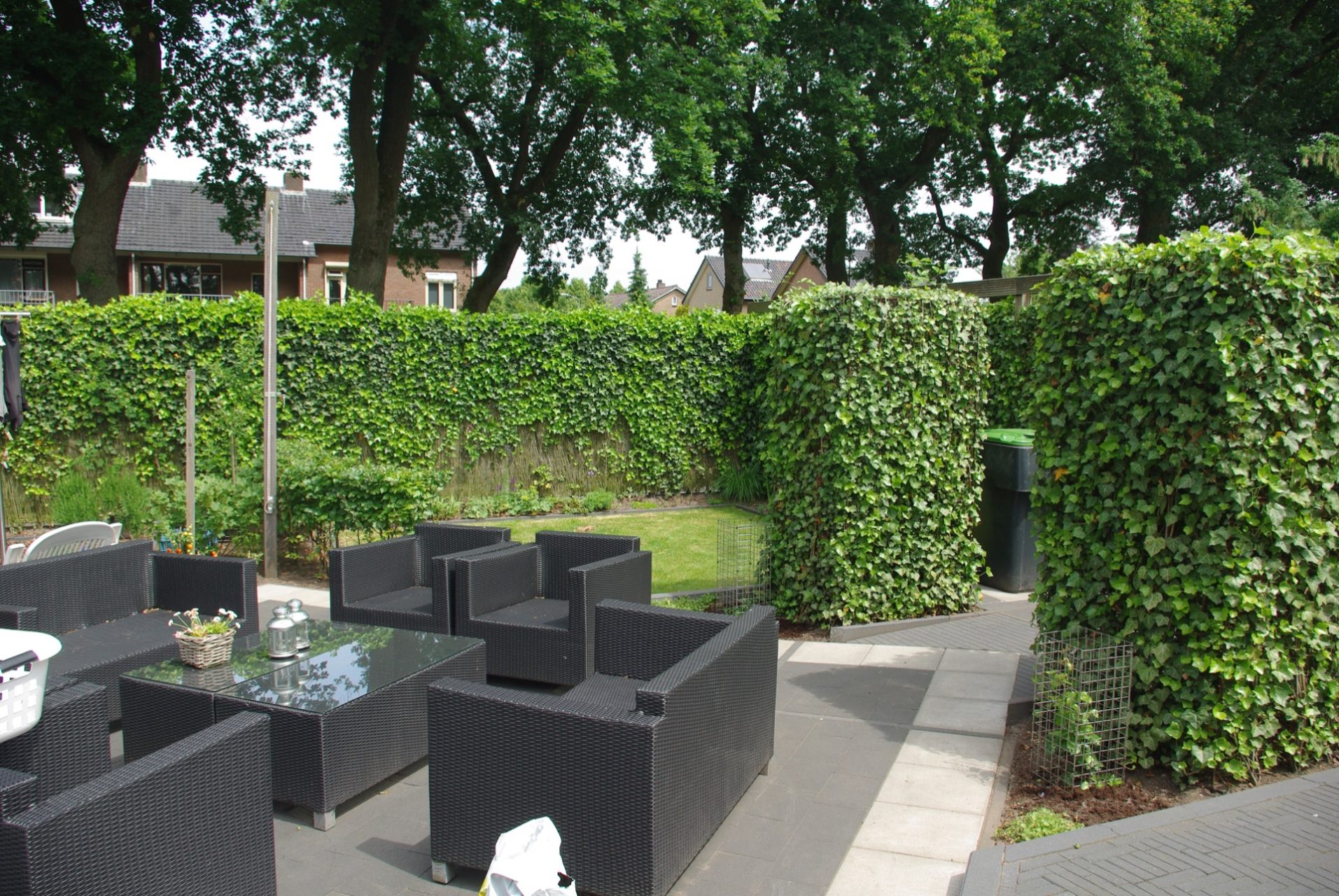 De achtertuin is het zonnigst en wordt omsloten voor meer privacy. In de achtertuin gaat het meest geleefd worden. Hier dient ook het grote terras te worden gesitueerd.